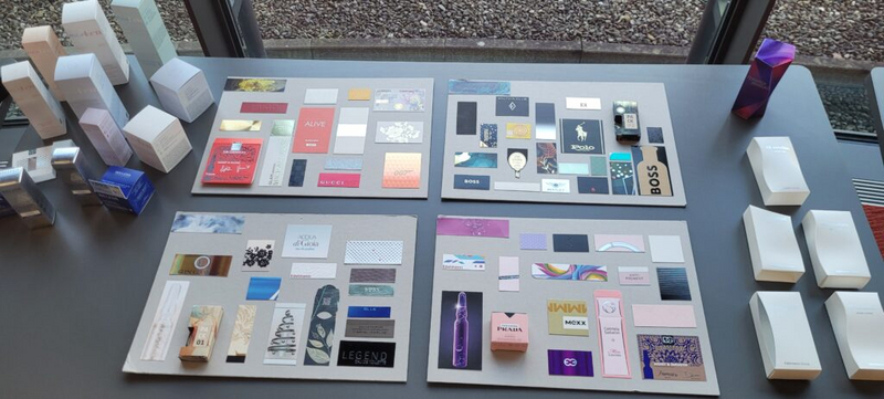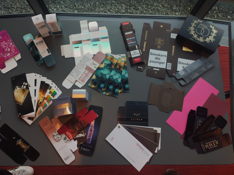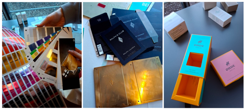 Following the introduction, we explored a broad selection of packaging samples and materials. We examined different structural formats, including solutions with inserts and inlays, and reviewed multiple finishing options such as embossing/debossing, special varnishes, metallic effects, foil stamping, and a wide range of color variations. Color and finishing swatches helped demonstrate how visual and tactile effects are selected and standardized for premium products.
