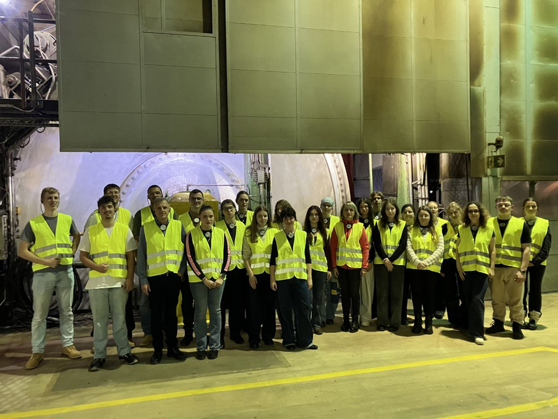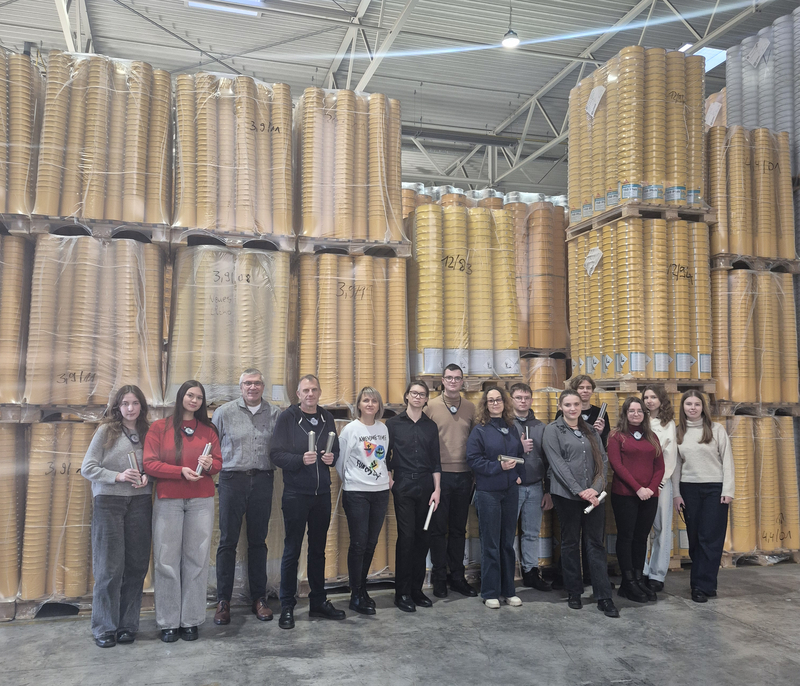 During the guided tour, the students observed the complete technological process of recycled cardboard production. At first waste paper from various sources is sorted and fed into pulping units. Here, it is mixed with water and mechanically processed to separate the fibers into a homogeneous pulp. The pulp undergoes rigorous cleaning stages. Advanced screening, filtration, and flotation technologies are used to remove impurities such as plastics, metals and printing inks. The cleaned pulp is distributed onto moving forming screens in the paper machine to create a uniform cardboards sheet. It then passes through pressing sections to remove excess moisture and establish the necessary density, strength and mechanical stability. The formed cardboard travels through multiple heated cylinders in the drying section. Once the desired moisture level is reached, surface treatments and smoothing are applied before the final product is cut into sheets or wound into massive rolls. Quality control procedures are integrated throughout the entire production process to ensure compliance with technical, safety, and performance standards.
